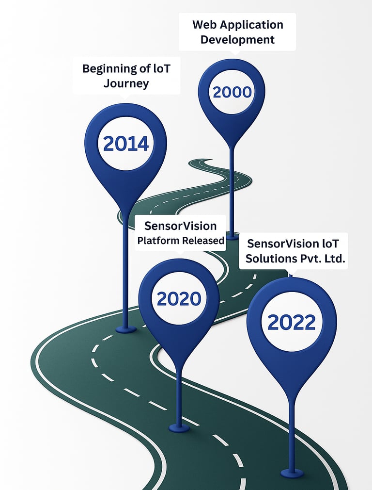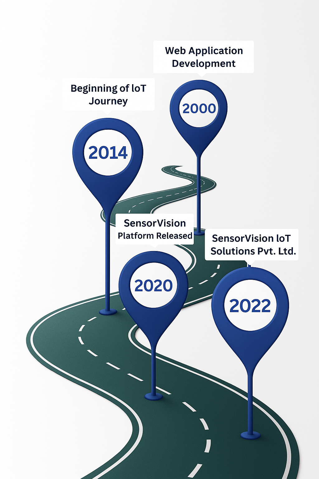 Our journey began in 2000 with web development services, and in 2014, we took our first step into the world of IoT. As we engaged with innovators and industries, the need for a streamlined, flexible IoT platform became clear. The vision for SensorVision emerged in 2020, and by 2022, it was officially launched as an end-to-end IoT platform tailored for modern digital transformation.